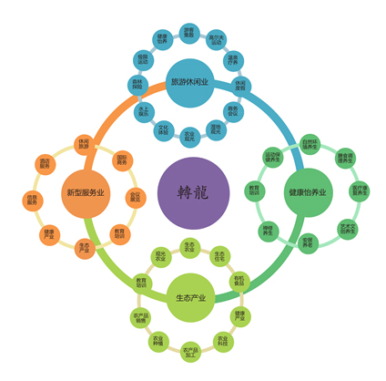 基于轉龍的自然文化資源,思凱來項目組為轉龍確定的核心產(chǎn)業(yè)為“健康產(chǎn)業(yè)+旅游業(yè)=健康怡養(yǎng)產(chǎn)業(yè)”。“旅游業(yè)+健康產(chǎn)業(yè)”作為核心產(chǎn)業(yè),聯(lián)動當?shù)氐纳鷳B(tài)產(chǎn)業(yè)和新型服務業(yè),如農林漁產(chǎn)業(yè)、手工業(yè)、加工業(yè)、餐飲業(yè)等。因此,思凱來項目組將轉龍的支柱產(chǎn)業(yè)定義為旅游休閑業(yè)、健康頤養(yǎng)業(yè)、生態(tài)產(chǎn)業(yè)和新型服務業(yè)。