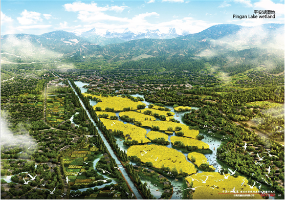生機盎然的濕地、遠處的轎子雪山、近處的轉龍民俗小鎮(zhèn)構成一幅美麗的畫卷,形成了項目“雪山水鄉(xiāng)”的核心意象。