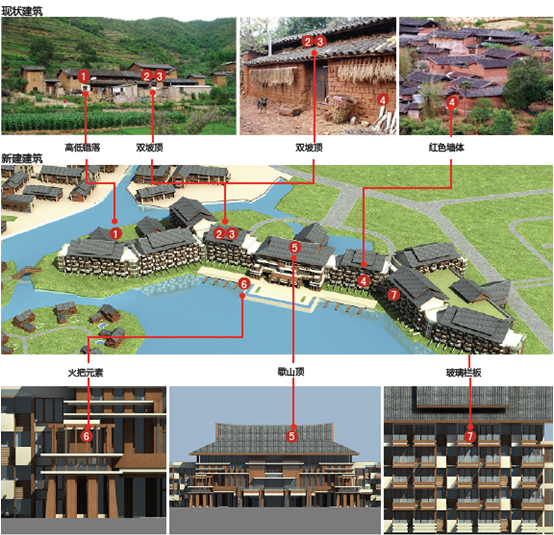 思凱來項目組在分析轉龍地區(qū)民居建筑的基礎上,運用了小型尺度、青瓦屋面、外露通心穿斗結構、木制門窗與飾面、黏土紅墻、毛石勒腳等傳統(tǒng)建筑語匯,結合了彝族“火把”的意象,對水韻東方酒店做了概念性的規(guī)劃和設計。