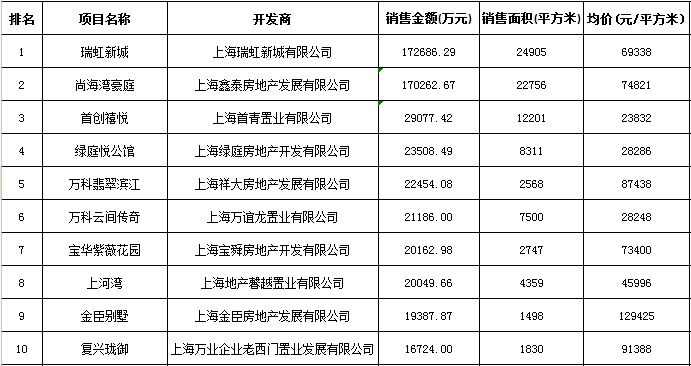 成交量方面,瑞虹新城怡庭和尚海灣豪庭成交均價(jià)分別為6.9萬元/平方米和7.5萬元/平方米,且均位列成交量與成交金額榜單的前二名。