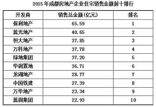 2015年,保利以全年銷售額超65億人民幣連續(xù)六年蟬聯(lián)成都樓市銷冠,位居第二的藍(lán)光地產(chǎn)銷售額共約40億。