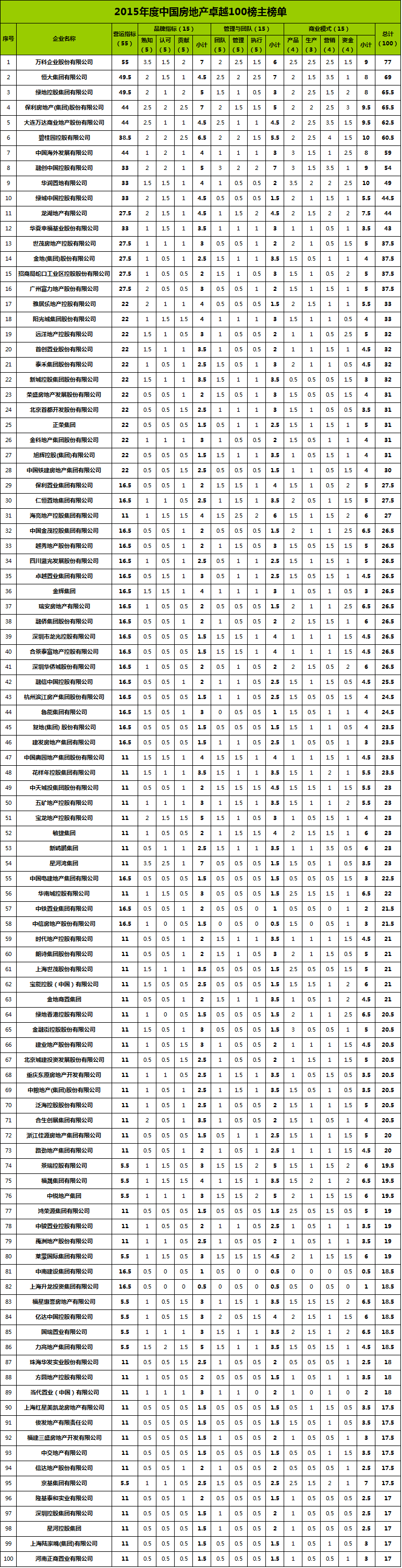 觀察榜單不難發(fā)現(xiàn),萬科連續(xù)七年成為卓越100榜第一名,可以說是實至名歸的行業(yè)龍頭企業(yè),但總得分77分較此前幾年都更低(2014年度:85.5分;2013年度:84分;2012年度:94分)。