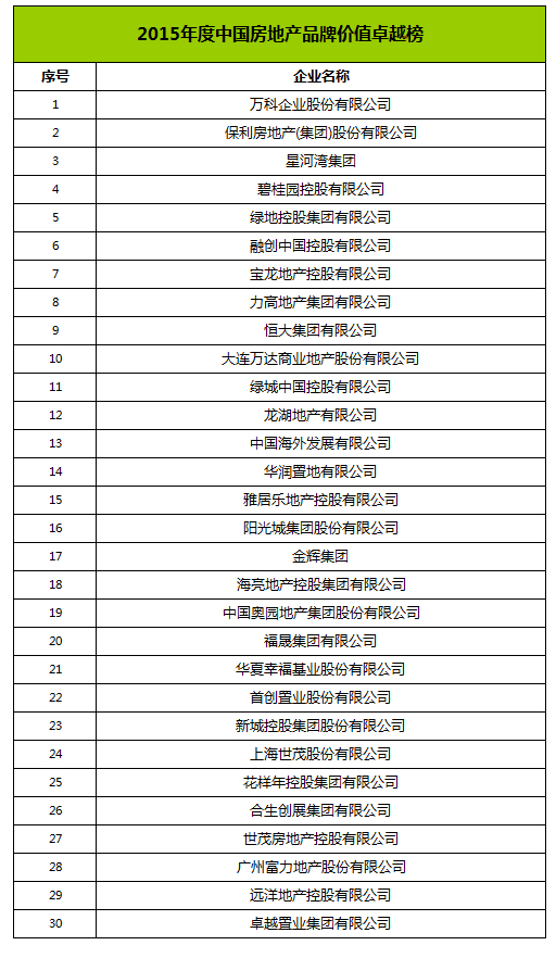 以下為2015年度中國(guó)房地產(chǎn)品牌價(jià)值卓越榜榜單排名: