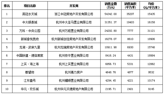 杭州區(qū)域房地產(chǎn)項目一周銷售數(shù)據(jù)(2016年5月30日-6月5日)
