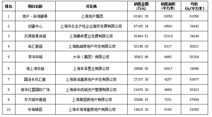 其中,成交最好的兩個項目為海上灣華庭和風荷麗景尚城,成交面積分別為16917平方米和15391平方米;在成交面積排名前十的項目中,尚海酈景名苑和尚匯豪庭二期兩個項目成交均價最高,分別為80356元/平方米和82530元/平方米。