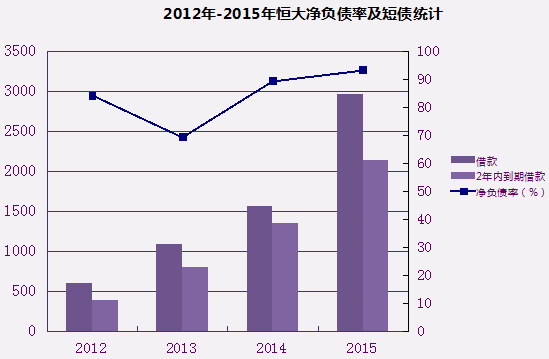 具體分析,恒大公告顯示,2013年借款共1088.2億元,1年內(nèi)到期的為358億元,占比32.9%;2014年借款1561億元,1年內(nèi)到期的約797億元,占比51%;2015年借款2969億元,1年內(nèi)到期的約1587億元,占比53.5%。