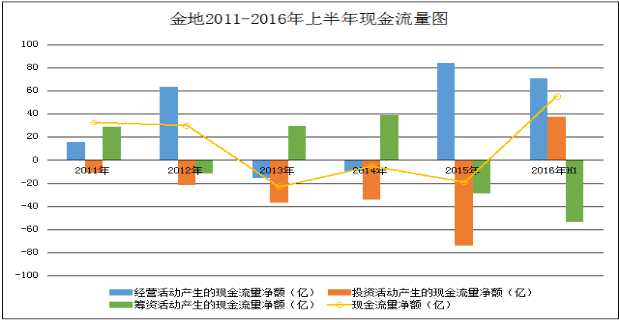 2013年,金地經(jīng)營(yíng)活動(dòng)產(chǎn)生的現(xiàn)金流量?jī)纛~為-15.61億,投資活動(dòng)產(chǎn)生的現(xiàn)金流量?jī)纛~為-36.80億,而籌資活動(dòng)產(chǎn)生的現(xiàn)金流量?jī)纛~則為29.78億,如此靠借債維持日常經(jīng)營(yíng)和投資活動(dòng)下,總體現(xiàn)金流量?jī)纛~仍然顯示“入不敷出”,為-22.64億元。