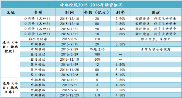 另?yè)?jù)公告顯示,2016年,綠地控股通過(guò)境外全資子公司綠地全球投資有限公司發(fā)行了3億美元的三年期中期票據(jù)以及1.8億美元三年期定息債券。