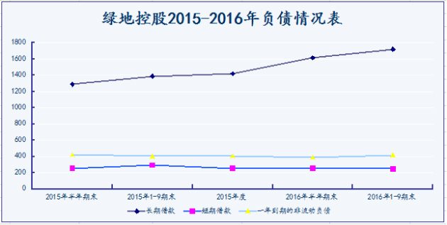 從債務(wù)結(jié)構(gòu)來(lái)看,綠地控股的長(zhǎng)短借款占比有小幅的優(yōu)化。2015年半年、三季度、年度以及2016年半年、三季度,綠地控股的短期借款為254.49億元、295.32億元、255.35億元、258.55億元和248.41億元;長(zhǎng)期借款則為1289.40億元、1389.53億元、1419.73億元、1615.21億元和1724.6億元。