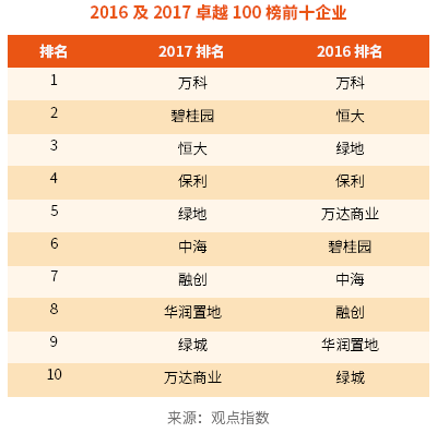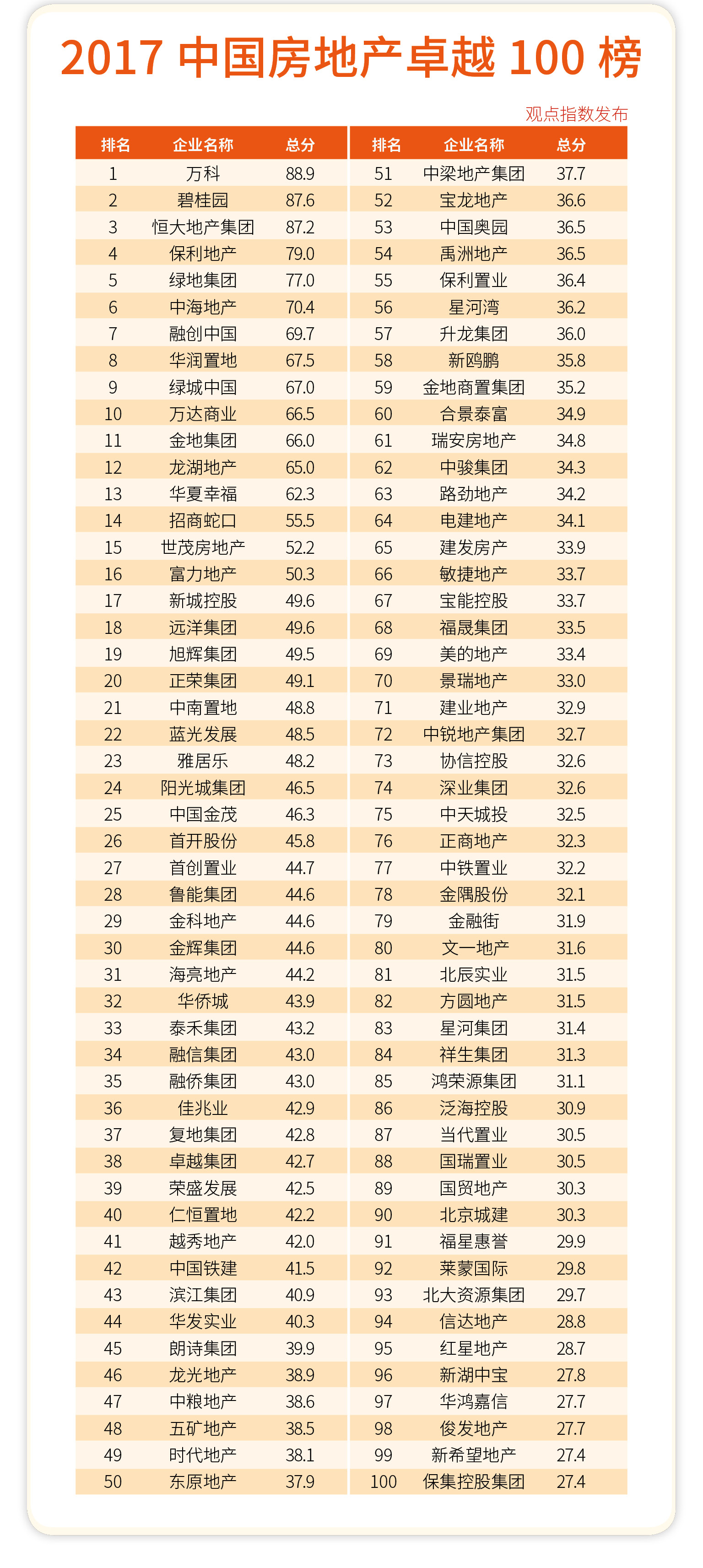 2017中國房地產(chǎn)卓越100榜分榜單:
