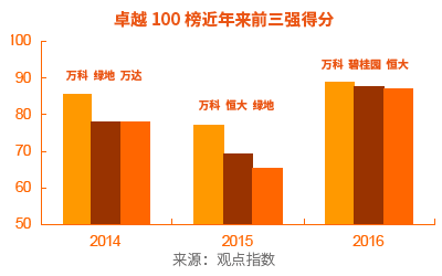 德信的表現(xiàn)是可圈可點,此前連續(xù)兩年排在第九名,2016年連跳四級,位居第五,營運指標(biāo)、區(qū)域推動力取得了不俗成績。旭輝、保利、龍湖等各方面表現(xiàn)穩(wěn)定,期待進(jìn)一步提升。