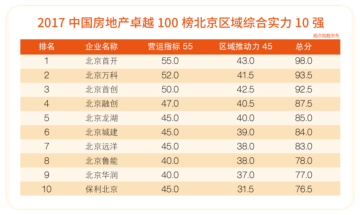 觀點新媒體根據(jù)企業(yè)申報材料及問卷調(diào)查進(jìn)行綜合統(tǒng)計分析,根據(jù)各項指標(biāo)的綜合得分及單項指標(biāo)得分產(chǎn)生2017中國房地產(chǎn)卓越100榜。