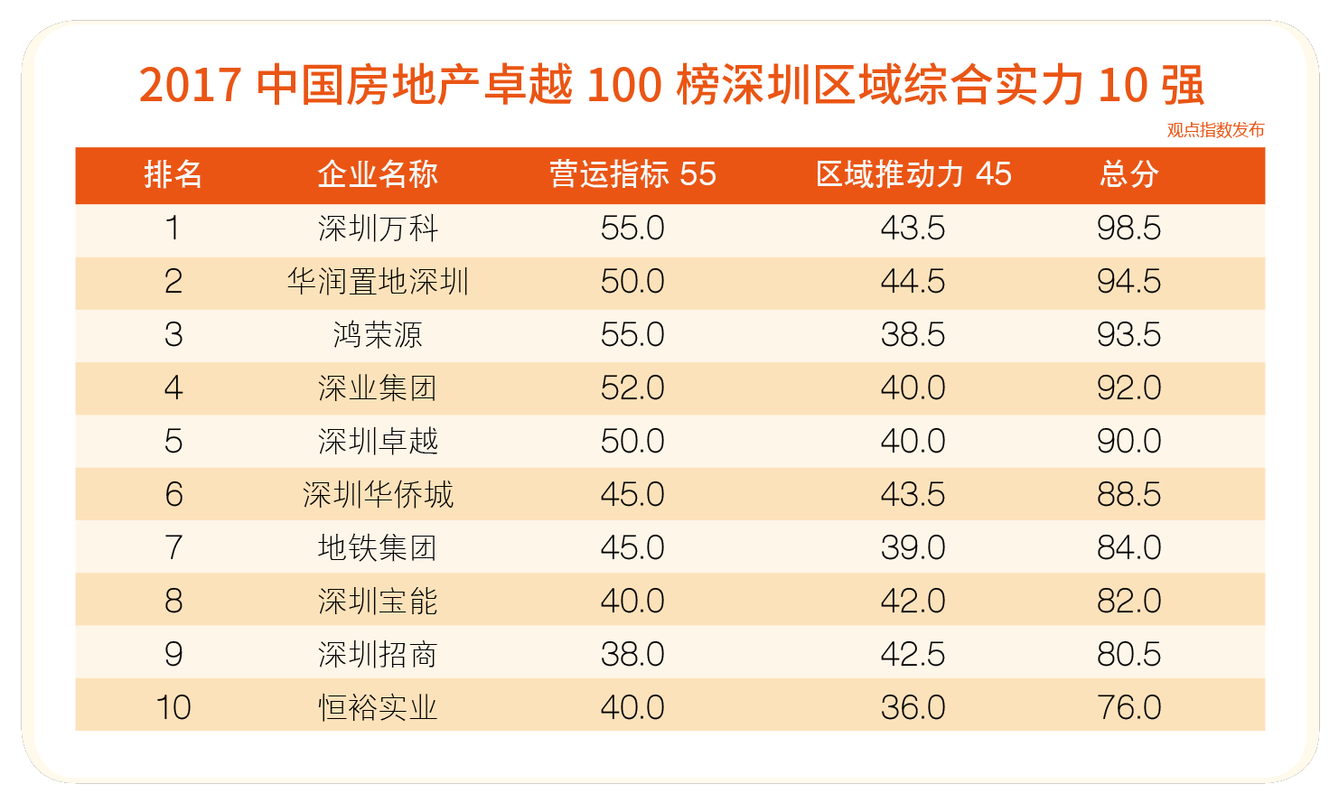 2017中國房地產(chǎn)卓越100榜深圳區(qū)域綜合實力10強