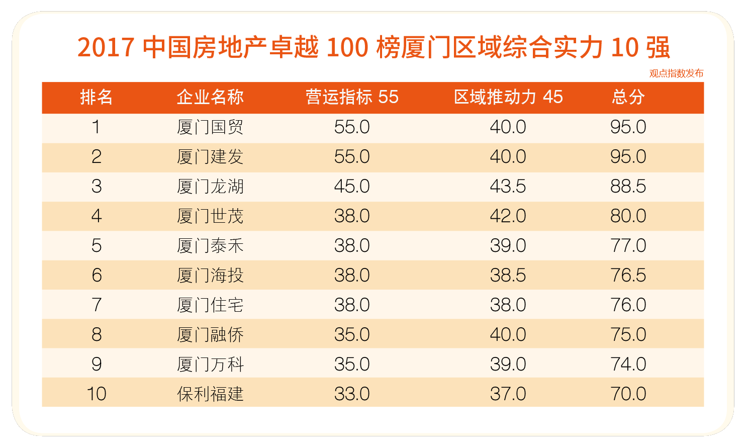2017年度中國房地產(chǎn)卓越100榜廈門區(qū)域綜合實力10強榜單中,廈門本地房企占據(jù)了6席。