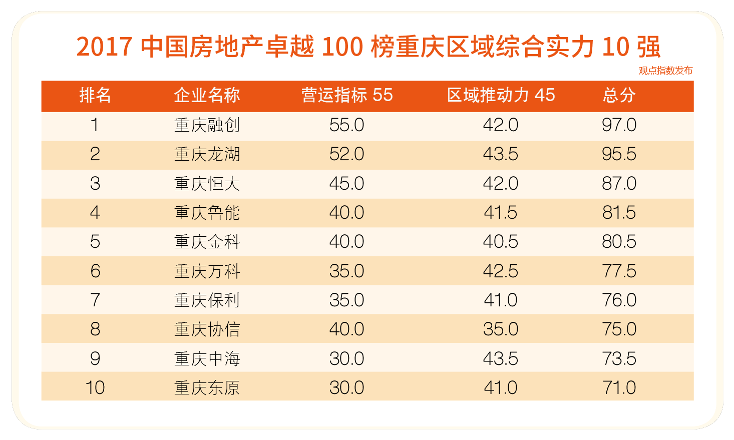 從2017年度中國房地產(chǎn)卓越100榜重慶區(qū)域綜合實力10強來看,重慶本地房企的表現(xiàn)還是值得肯定,入榜的企業(yè)有協(xié)信、金科、東原以及重慶起步的龍湖,外地房企則以品牌房企為主,如萬科、中海、保利都榜上有名。