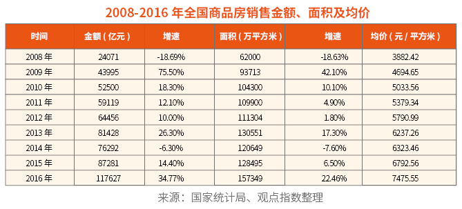 對比2008年以來全國商品房銷售金額、面積及增速,2016年度銷售金額及銷售面積增速之亮眼,僅次于2009年“四萬億”救市刺激政策出臺之后的房地產(chǎn)大年。