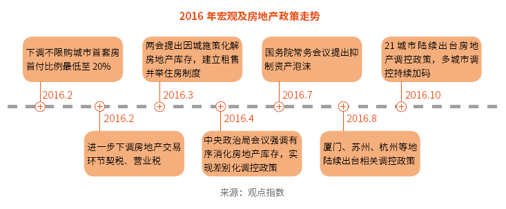 2016年,房地產(chǎn)成交量價齊漲的局面已經(jīng)落定,但隨著10月份開始全國二十多個重點城市出臺房地產(chǎn)調(diào)控措施,樓市基調(diào)從“去庫存”轉(zhuǎn)向“抑泡沫”。