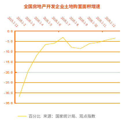 國家統(tǒng)計局發(fā)布的數(shù)據(jù)顯示,2016年,房地產(chǎn)開發(fā)企業(yè)土地購置面積22025萬平方米,比上年下降3.4%,降幅比1-11月份收窄0.9個百分點;土地成交價款9129億元,增長19.8%,增速回落1.6個百分點。