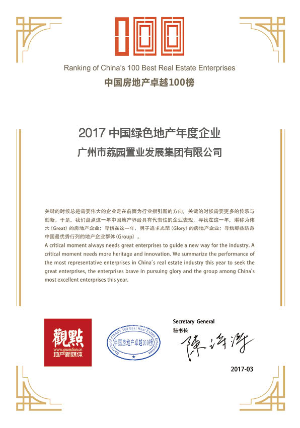 ▲荔園地產(chǎn)榮獲“2017中國綠色地產(chǎn)年度企業(yè)”證書