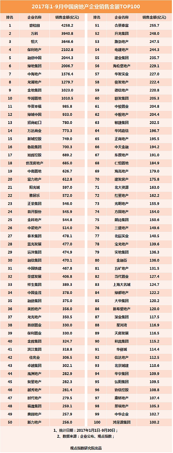 截止到2017年9月底,觀點指數(shù)統(tǒng)計已經(jīng)總共已有百余家房企突破了百億銷售,值得注意的是,有一小部分企業(yè)因為無法獲取準確銷售數(shù)據(jù),觀點指數(shù)將之剔除在榜單之外,而這其中有一部分也可能已經(jīng)達標百億。