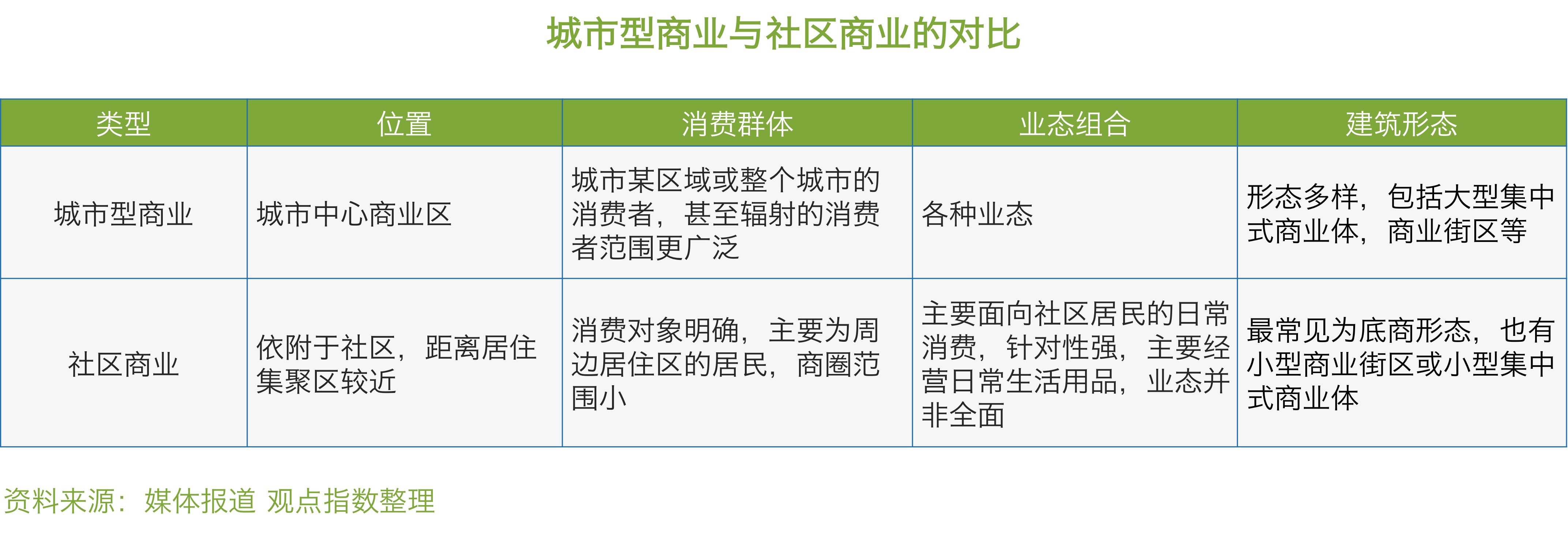 居住區(qū)商業(yè)指在居住區(qū)內(nèi),服務(wù)對(duì)象主要為該居住區(qū)居民,屬于較完善的社區(qū)商業(yè)形式;社區(qū)商業(yè)中心指在多個(gè)居住區(qū)的中心,服務(wù)對(duì)象為該區(qū)域及部分外來(lái)消費(fèi)者的,集中設(shè)置的規(guī)模較大的社區(qū)商業(yè)形式。