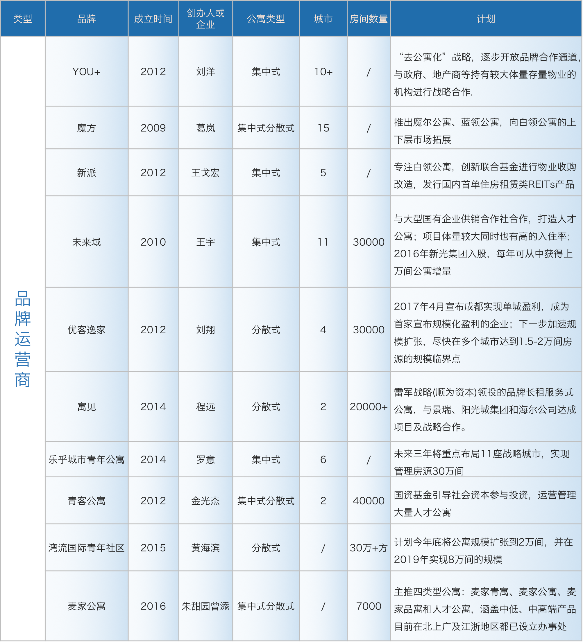 可以看到的是,這一領(lǐng)域已經(jīng)由品牌公寓的試煉場變成了包括房企、中介及互聯(lián)網(wǎng)、資產(chǎn)管理等各方資本競相角逐的領(lǐng)域,這個市場正如政策導(dǎo)向所希望的,其供給主體正變得多元化。按照住房租賃市場中機構(gòu)的供給主體的不同,目前國內(nèi)長租公寓可劃分的類型和相應(yīng)的玩家主要有: