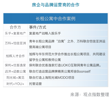 從目前長租公寓的構(gòu)成主體來看,房企、品牌公寓、中介和互聯(lián)網(wǎng)企業(yè)呈現(xiàn)出合作與競爭的格局。其中目前強勢切入的房企,除了自創(chuàng)品牌以外,亦采用和其他品牌合作的方式進行快速布局,其合作的形式有委托管理、合資公司、戰(zhàn)略入股以及直接收購。