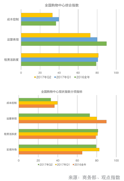 另一方面,商務(wù)部最新發(fā)布的2017年第二季度中國購物中心發(fā)展指數(shù)表明,今年二季度購物中心租賃活躍度指數(shù)環(huán)比一季度減少了6.7至33.0,低于榮枯線17.0,“說明業(yè)主的運營成本繼續(xù)上升,主要源于業(yè)主繼續(xù)加大在營銷和技術(shù)應(yīng)用等方面的投入。”