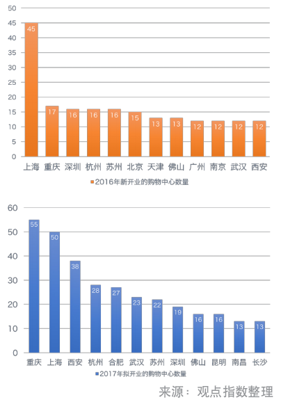 來自世邦魏理仕的一份全球購物中心報告則顯示,2016年全球新建成購物中心1250萬平方米,錄得11.4%的增長,而中國以全年575萬平方米的新建面積位列第一。全球十大新建購物中心城市中,中國熱點一二線城市即占了七席,依次為上海、北京、重慶、成都、南京、深圳和天津。