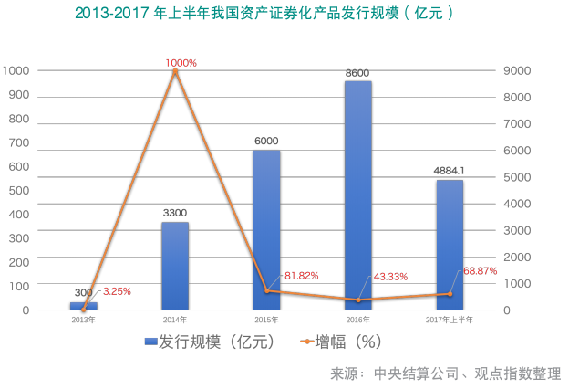 根據(jù)中央結(jié)算公司的數(shù)據(jù)統(tǒng)計(jì),2013-2016年,我國資產(chǎn)證券化發(fā)行額逐年遞增,由2013年300億元上漲至2016年的8600億元,增長近28倍。截至2017年上半年,全國共發(fā)行資產(chǎn)證券化產(chǎn)品4884.1億元,同比增長68.87%,市場存量為14624.78億元,同比增長66.48%。