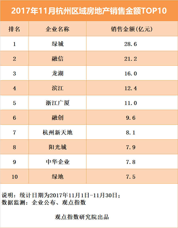據(jù)觀點(diǎn)指數(shù)統(tǒng)計(jì),11月房企銷(xiāo)售排行中,除綠城、融信、濱江、融創(chuàng)與10月無(wú)異,分別位列第一、第二、第四和第六,其余排位均發(fā)生變化,更有4家房企首次闖入前十,包括兩家杭州本土企業(yè)浙江廣廈、杭州新天地,以及來(lái)自上海的中華企業(yè)和綠地。