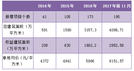 在物流方面,萬科于2015年成立物流地產(chǎn)發(fā)展有限公司,此后逐年擴充物流儲備。至2017年11月底公司年內(nèi)新增物流項目32個,高于過去兩年總和(18個);總建筑面積247.4萬平方米,權(quán)益建筑面積206.1萬平方米,需支付權(quán)益價款26.8億元。