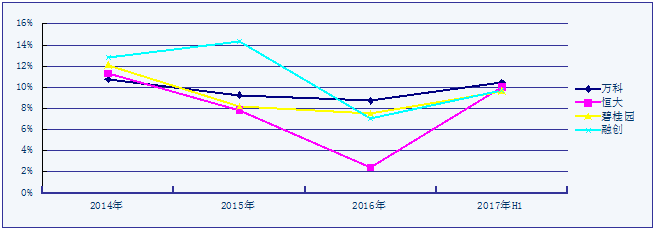 近年來,受市場調(diào)整、行業(yè)競爭以及地價占比日益提升等因素影響,房地產(chǎn)行業(yè)的利潤率普遍有所下降。以銷售規(guī)模在行業(yè)前列的房企為例,2014-2016年,碧桂園、恒大、萬科、融創(chuàng)的凈利率均降至10%以下,至2017年上半年才有所回升。