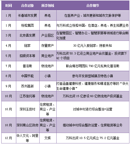 2017年3月底,萬科首席運營官張旭便明確表示,公司會積極關(guān)注土地市場存量市場的機會。而借助第三方力量加快自身戰(zhàn)略轉(zhuǎn)型的投資運作,成為萬科目前的主要訴求,僅2017年間,該公司先后與包括房企、基金、政府、城中村等十幾個機構(gòu)開展新業(yè)務(wù)合作。