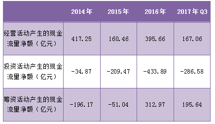 數(shù)據(jù)顯示,萬科過去四年經(jīng)營活動產(chǎn)生現(xiàn)金流量凈額一直為正,反映房地產(chǎn)銷售回款穩(wěn)定;但投資活動持續(xù)為負(fù),至2017年9月底擴大至-286.58億元,則意味著對外投資力度逐年加大。受此影響,萬科前三季度取得借款現(xiàn)金達(dá)504.69億元,較上期增長一倍。