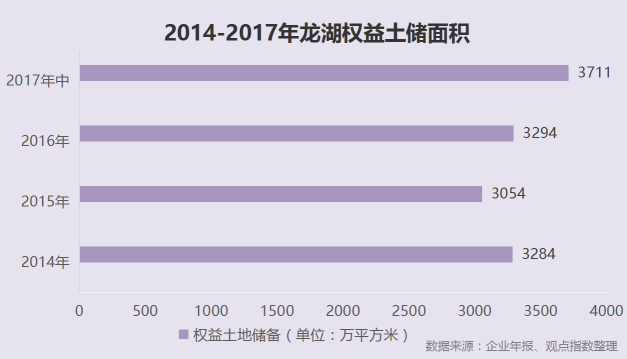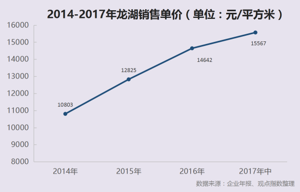 上述區(qū)域人口集中,購房需求比較大,龍湖的銷售單價也由2014年的10803元/平方米,提高到2017年中期的15567元/平方米。這種情況下,努力加大供應(yīng)量就能較快實現(xiàn)銷售額的增長,很大程度上促進了2017年沖擊1600億合約銷售的可能。