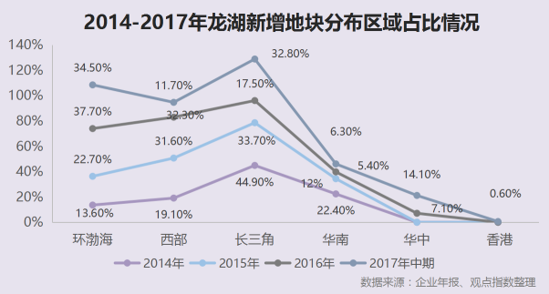 從數(shù)據(jù)來看,2014年-2017年中期,龍湖有計劃地調(diào)整新增土地的區(qū)域選擇,由原來的重倉長三角、華南區(qū)域,向環(huán)渤海和西部傾斜,并新增了華中和香港兩個區(qū)域。