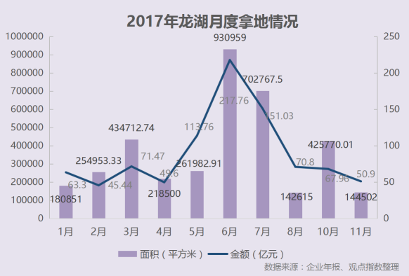據(jù)觀點指數(shù)不完全統(tǒng)計,截至2017年11月30日,龍湖通過公開市場、收購以及合作等方式,在北京、上海、香港、深圳等城市拿地369.76萬平方米,地塊合計44宗(含5宗合作地塊),土地價格共約902.02億元。其中7月拿地動作最為迅猛,單月納儲12宗,占前11個月的27.3%。