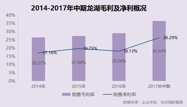 觀點指數(shù)從龍湖歷年財報獲悉,2014-2016年,龍湖銷售毛利率均保持較大增長,分別為26.51%、27.44%、29.08%。2017年上半年,得益于一二線產(chǎn)品的貢獻以及上海、重慶的高利潤物業(yè)交付,毛利達到67.93億元,毛利率由上年同期的27.9%提高至達36.5%,這也推動了龍湖的核心凈利潤同比增長18%至28.4億元。