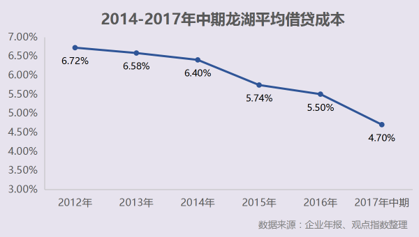 上述數(shù)據(jù)的變化,與龍湖平均借貸成本下降不無關(guān)系。觀點指數(shù)統(tǒng)計龍湖歷年財務(wù)數(shù)據(jù)獲悉,2012-2017年中,龍湖平均借貸成本持續(xù)下行,從6.72%、6.58%、6.4%、5.74%、5.5%進一步降低至2017年上半年的4.70%。