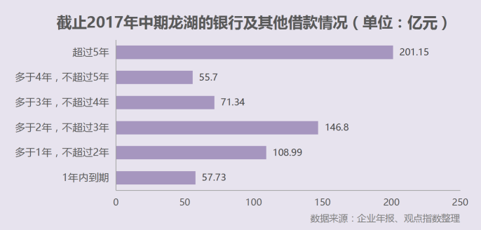 上述借款中,即將于一年內(nèi)到期的為57.73億元,一年后到期的款項為583.97億元,占總借款的大多數(shù),其中多于一年但不超過兩年的為109億元??偟膩碚f,龍湖的短期償債壓力并不大,長期債務(wù)分配也比較均勻。