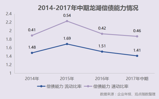 從償債能力來看,2014-2016三年中,持續(xù)增長的流動資產(chǎn)讓龍湖流動比率錄得波動上升,資金變現(xiàn)償債的水平得到提高,分別為1.48、1.69及1.51。不過剛剛過去的2017年中期,由于流動負(fù)債同樣錄得較大增長,因此流動比率下降明顯,僅為1.41。速動比率方面,受累于于存貨及待攤費用的占比上升,龍湖2017年的變現(xiàn)時間也較之前延長,較上年同期下降0.05,為0.46。