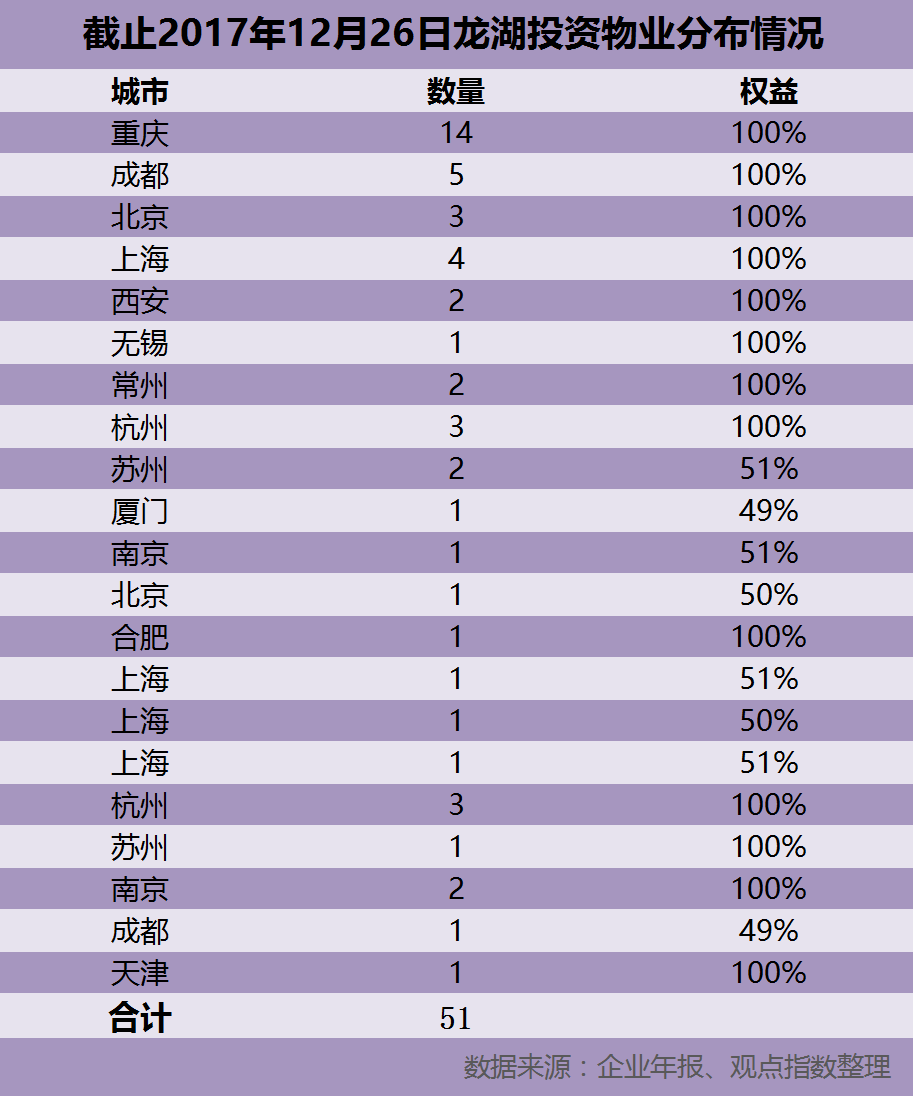 2017年最為明顯的就是龍湖在商業(yè)地產(chǎn)的投資有了較大提速。自2000年,龍湖開始涉足資金運營要求更高的持有型物業(yè),截至2017年12月26日,龍湖在重慶、杭州、南京、蘇州、天津、武漢等地共擁有投資物業(yè)51個,其中包括2017年補充的10個天街項目。