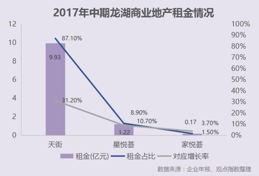 截止2017年6月30日,龍湖已開業(yè)投資性物業(yè)面積為208萬平方米(含車位總建筑面積為274萬平方米),整體出租率達到94.7%,不含稅租金收入11.4億元,較上年同期增長28.8%。其中,天街、星悅薈、家悅薈租金收入的占比分別為87.1%、10.7%、1.5%,對應(yīng)的租金收入增長率分別為31.2%、8.9%和3.7%。