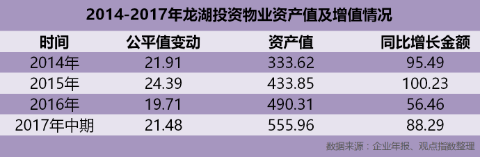 得益于已開業(yè)租金的上漲以及在建商場的持續(xù)投入,2017年1-6月龍湖錄得投資物業(yè)公平值增值約為21.48億元,同比增長24.52%,這個數(shù)字也較2016年全年的變動額增加1.77億元。同期,龍湖的投資物業(yè)資產(chǎn)值則從2016年末的490.31億元增加65.62億元至555.96億元。