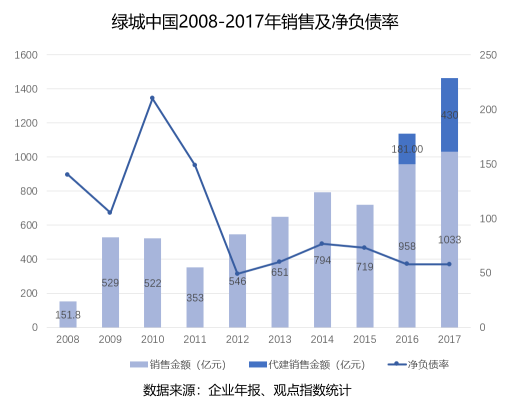 反映在數(shù)字上,2009-2014年,綠城的銷售復(fù)合增長(zhǎng)率只有不到10%。2014年底,隨著創(chuàng)始人宋衛(wèi)平的離場(chǎng),央企中交正式入主,這家房企巨頭開始有調(diào)整和喘息時(shí)間,負(fù)債率也逐年下降。