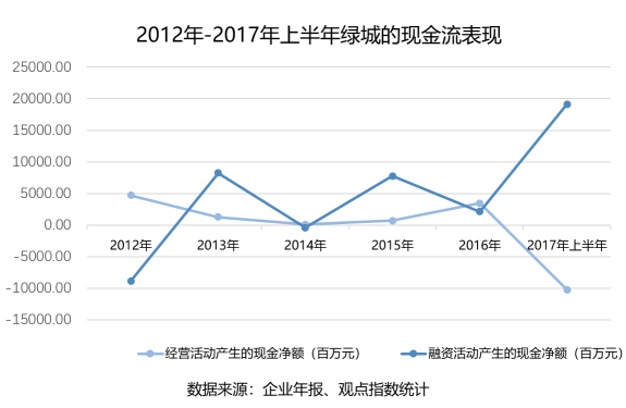 2017年上半年,綠城出現(xiàn)大量的經(jīng)營(yíng)活動(dòng)現(xiàn)金流出,而這一年綠城在土地投資上的也支出大大超過前幾年。