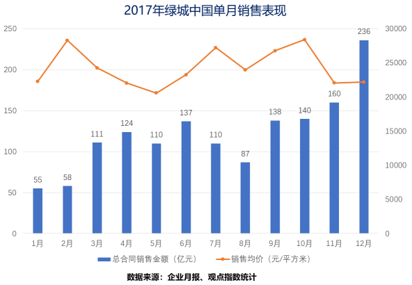 從2017年綠城每月的銷售情況也可看出,自3月份全國(guó)一二線的限購(gòu)限價(jià)政策推出之后,綠城銷售金額基本都突破百億,銷售均價(jià)也隨之下降,說明綠城正在努力處理三四線的庫(kù)存。