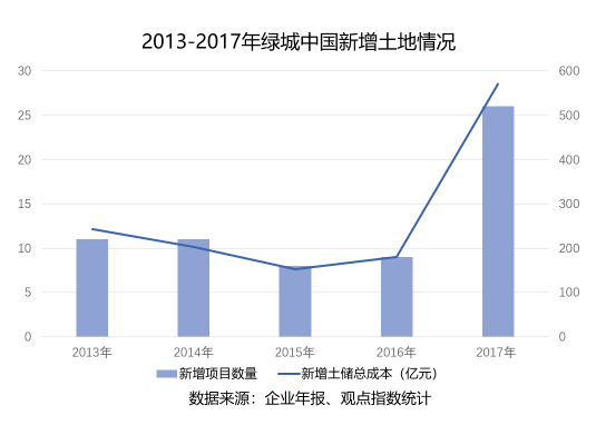 據(jù)觀點(diǎn)指數(shù)不完全統(tǒng)計(jì),截至2017年12月底,綠城2017年的土地金額已達(dá)到570億,雖然和碧桂園、恒大、保利等拿地大戶相比仍有差距,但這一數(shù)字已經(jīng)遠(yuǎn)遠(yuǎn)超過其2014-2016年三年的買地總額。