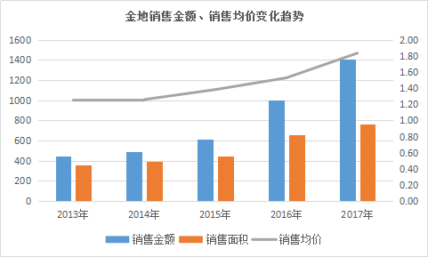 隨著合約銷售逐漸增長,金地的銷售均價也有所提升,觀點指數(shù)翻閱歷年報告,2013年至2016年,金地銷售均價分別為1.25萬/平方米、1.26萬/平方米、1.38萬/平方米、1.53萬/平方米,呈現(xiàn)不斷攀升的態(tài)勢。2017年,這一數(shù)據(jù)達到了1.83萬/平方米。